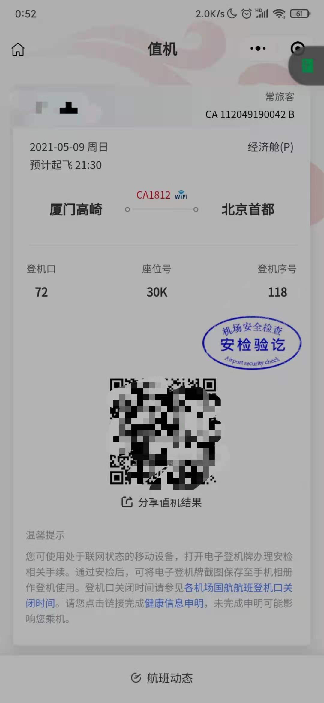 好家伙!差点出错赶不上,还好此时家属也提醒,可采用国航官网或小程序等形式做线上值机,现场可以直接安检。太好了!搞定