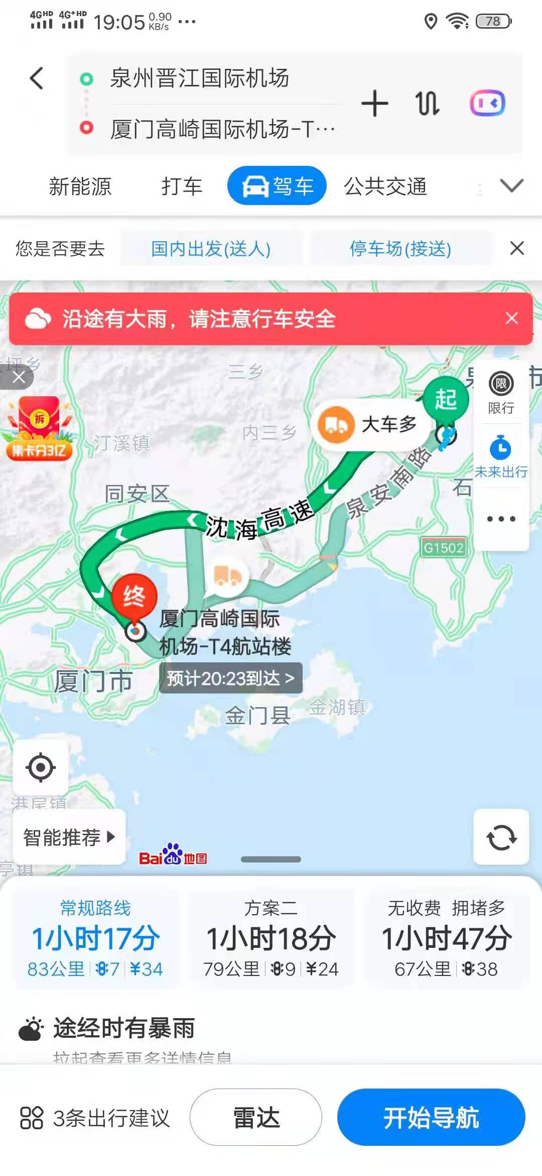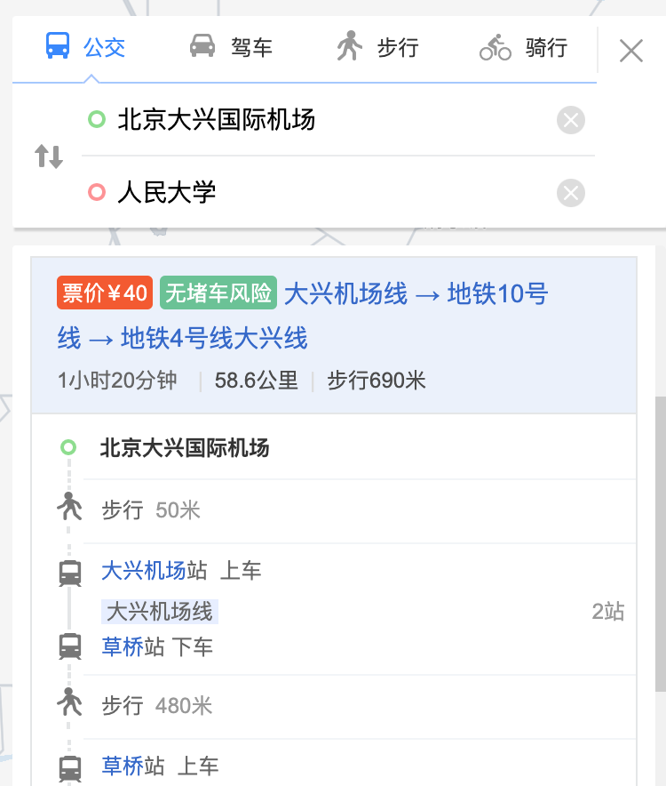 春节期间北京不让回乡,有接近一年没回内蒙,所以很早就确定五一回家。但婚礼8号在泉州,所以确定了直接从呼和浩特飞泉州的方案。因为呼和浩特飞晋江机场的没有直飞,中间要经停长沙,耗时较长,到达较晚,赶不上晚餐,所以买了呼和浩特直接到厦门高崎的飞机,准备从高崎打车到北站,再接驳高铁到泉州站。方案如下(当时没有留截图的都用现在的替代):